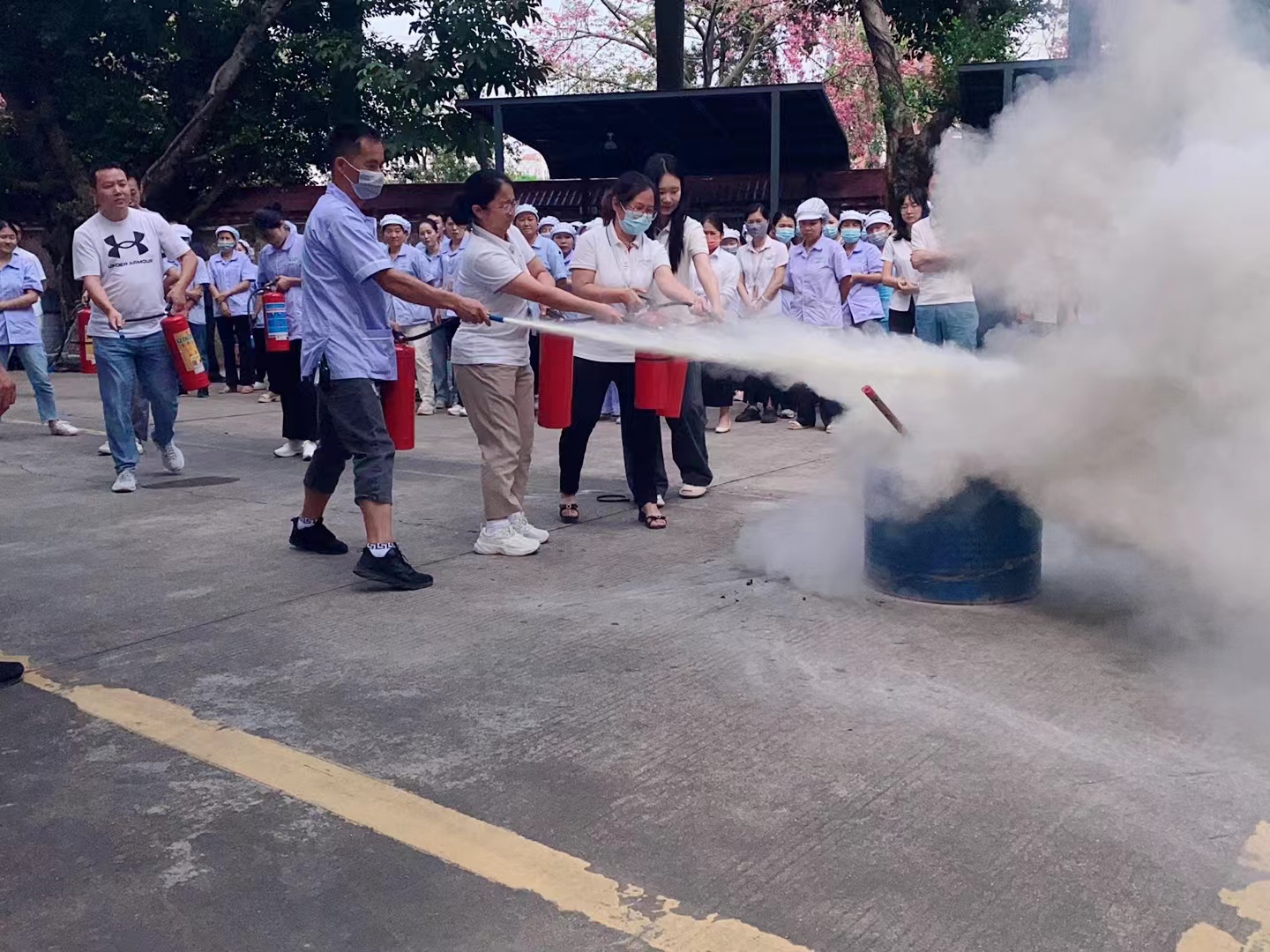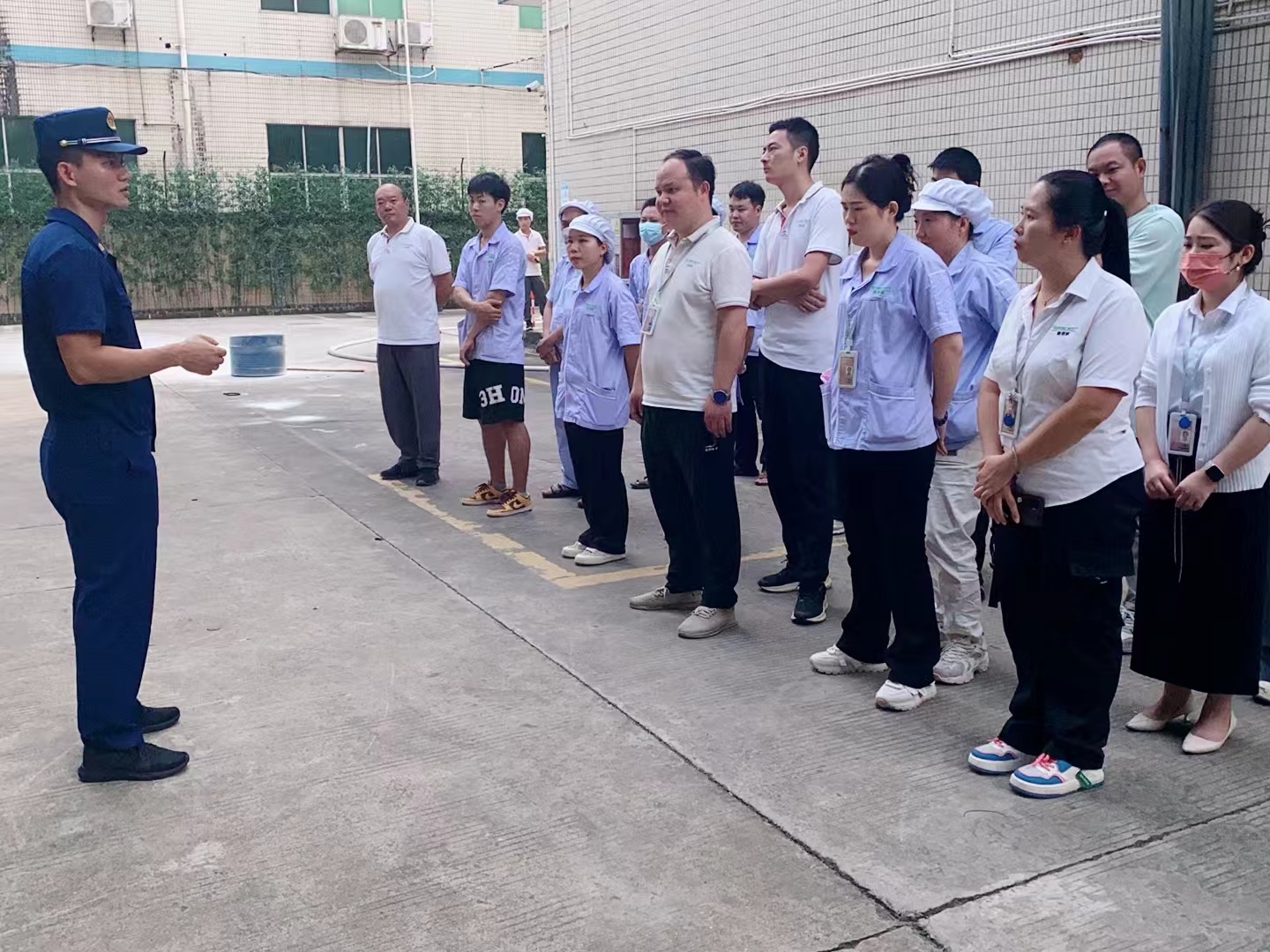隨著煙霧彌漫,警報聲驟然響起,雅香麗員工立即用手捂口鼻,快速有序地通過安全出口,逃離“火場”至安全地帶。隨后,消防車趕到現場,消防官兵迅速連接水帶、噴水槍,進入工廠內部實施撲救。